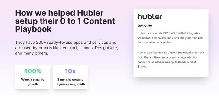 Hubler increased their organic progress up to 400% in a week with the help of around a hundred high-quality, SEO-optimized written materials.